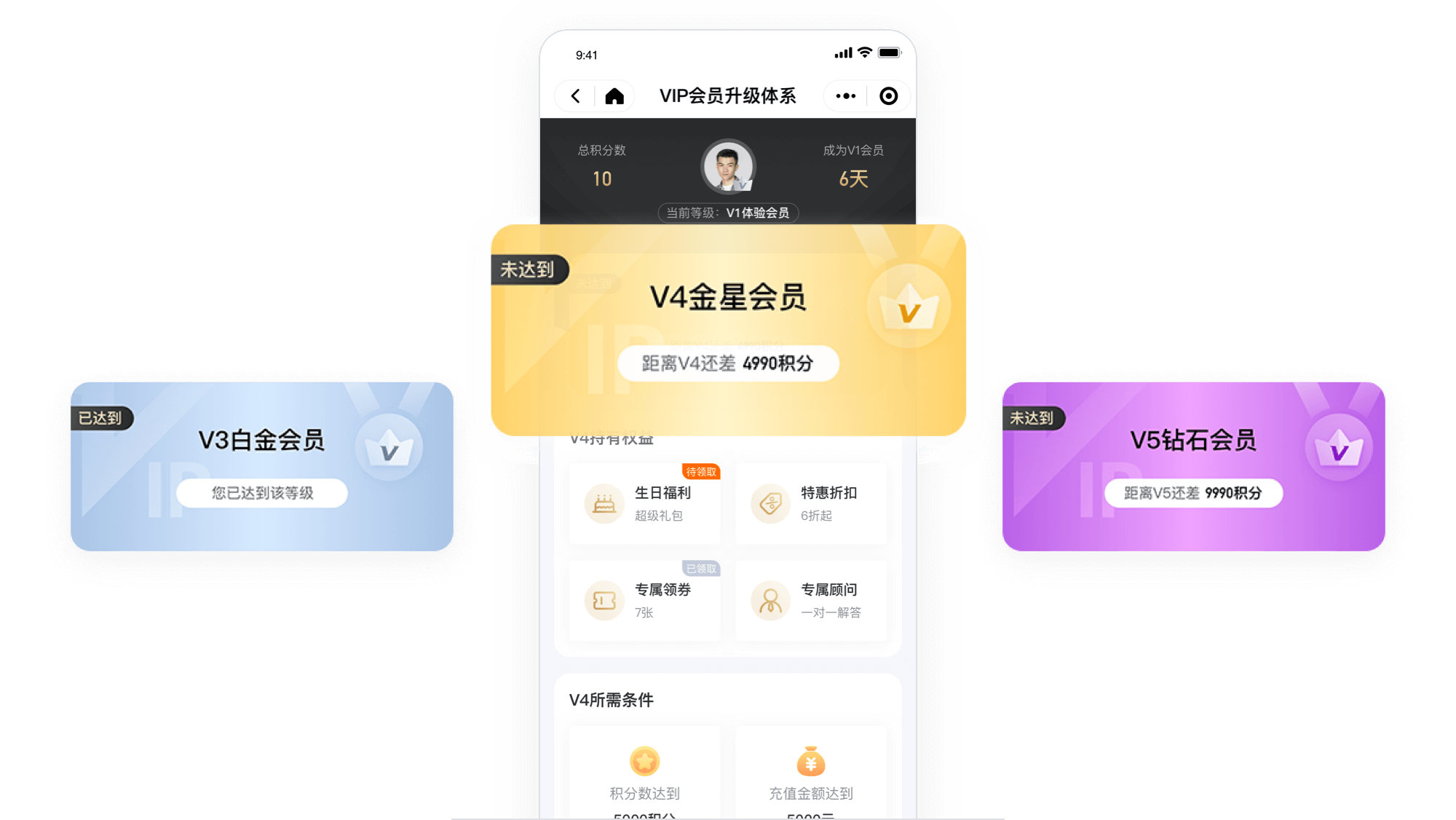 VIP会员等级最少要设置3级,最多设置5级,不同会员持有权益和所需条件均不同