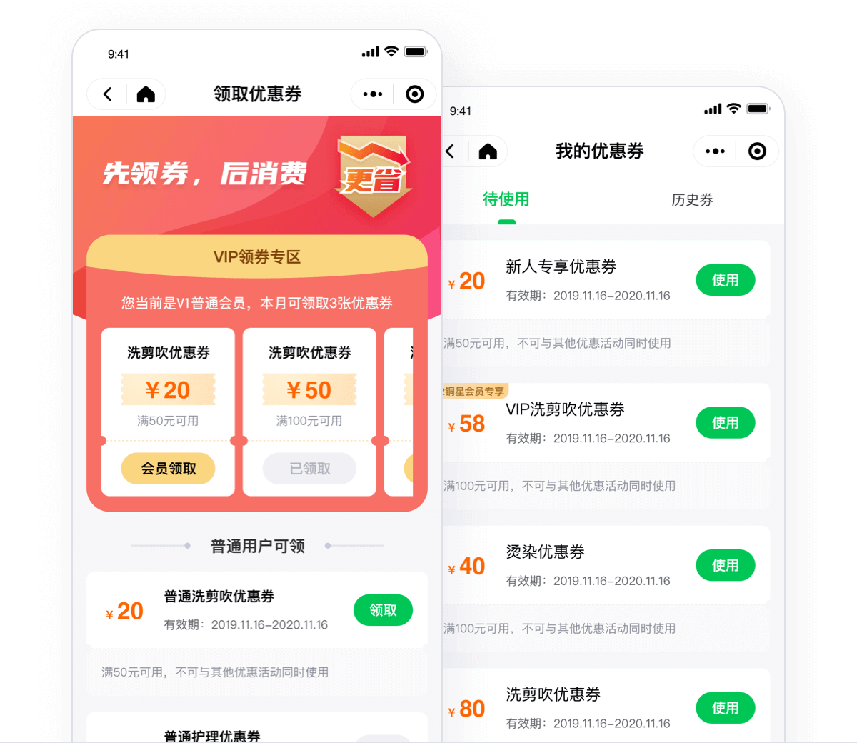 分为新人优惠券、普通用户券和VIP会员券,商户可在后台设置券的价值满减条件、有效期。