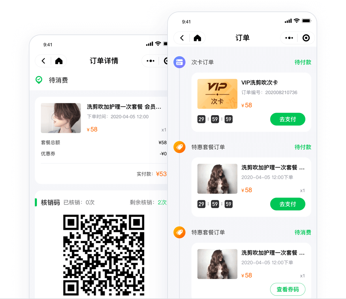 次卡订单:购买支付 > 出示次卡核销码(或会员码)消费 > 完成;