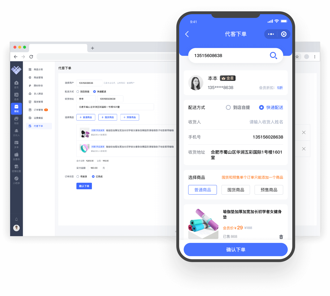 商户和员工可分别在PC管理端和手机上替客户下订单