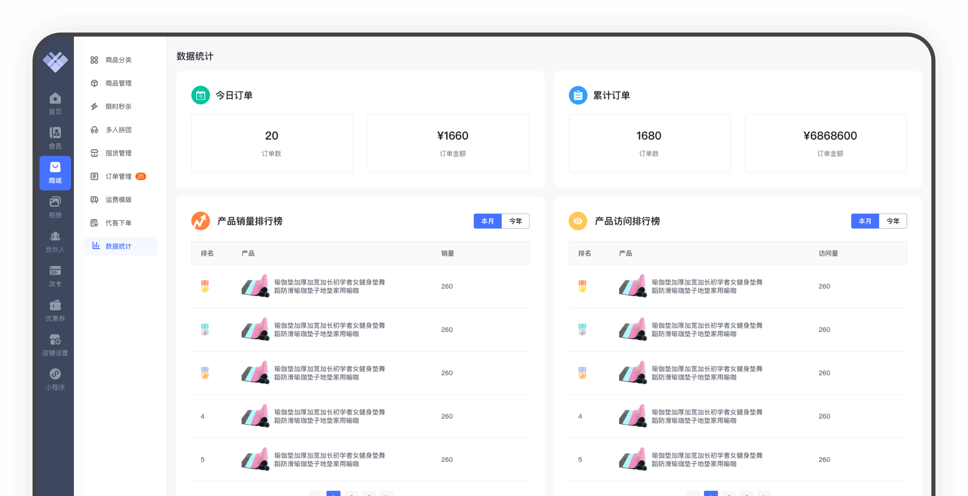 商城订单数、订单金额、产品销量排行榜、产品访问排行榜均可一目了然
