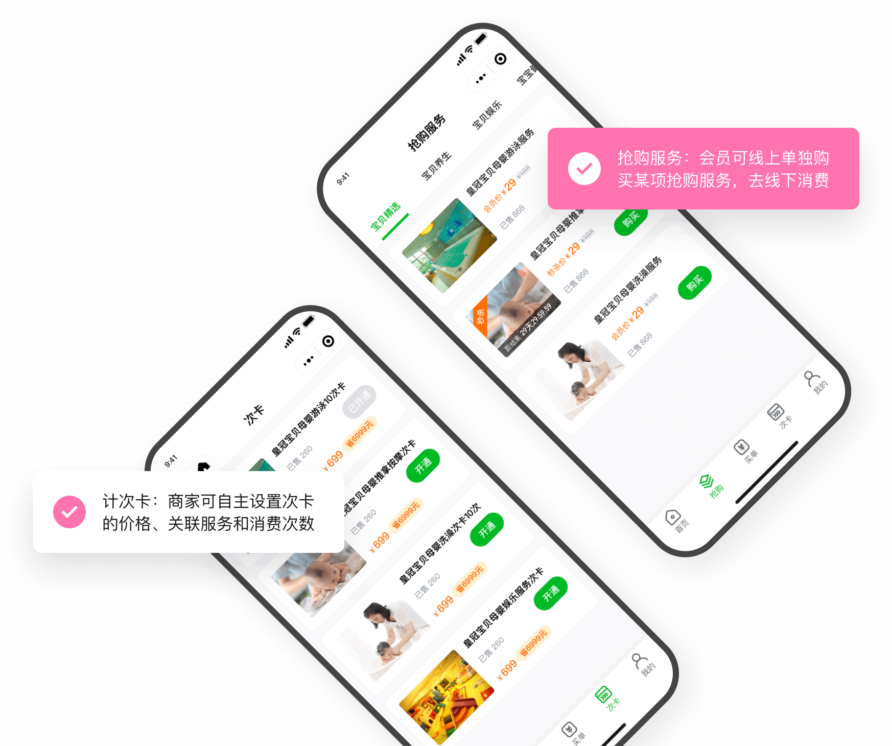 宝宝洗澡、游泳、按摩等服务项目可计次销售,消费直接扣减次数