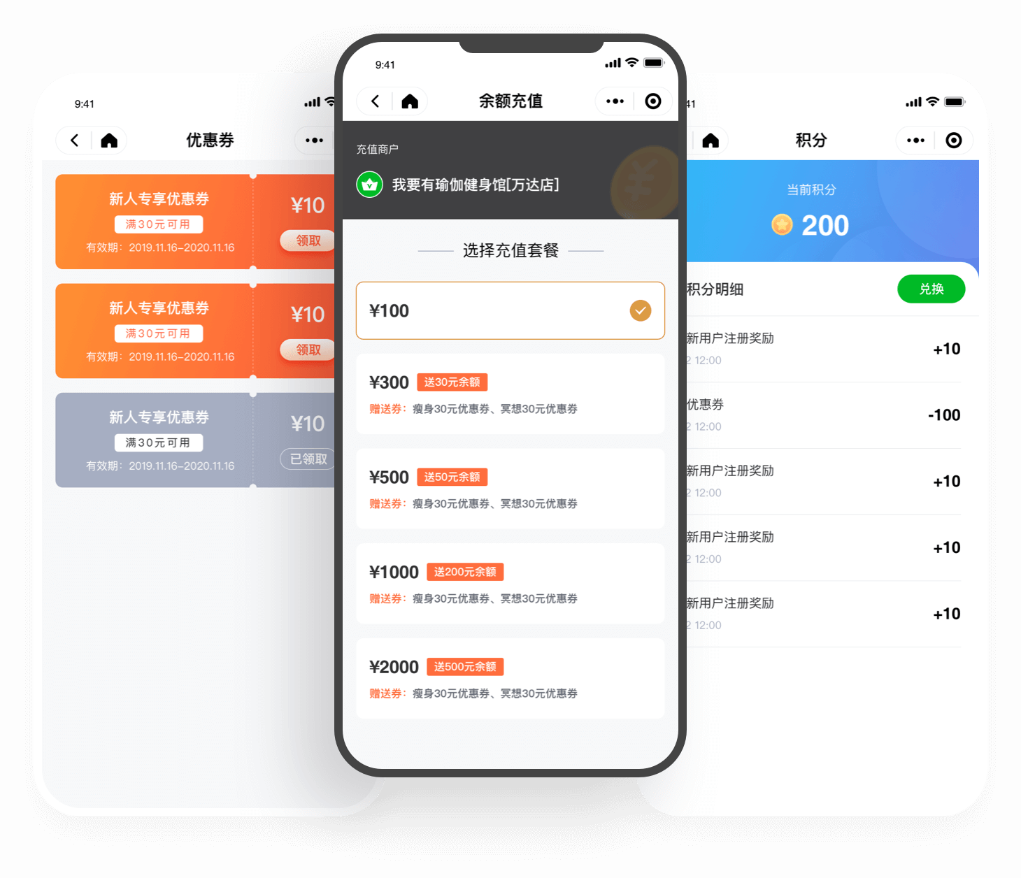 优惠券:新人送券、商家设置券会员即可领取,可用于抵扣消费等